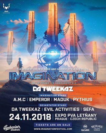 Na Imagination stage přiletí reprezentovat to nejlepší z drum & bassu přiletí jeden z nejlepších d&b světa – A.M.C, který se na jeho návrat na Imagination neuvěřitelně těší. Line up nabídne dále zakladatele labelu Liquicity a autora skvělých skladeb jako je „Ghost Assasin“ či každoročních Liquicity yearmixů – skvělého Maduka. Třetím jménem se stává reprezentant labelu Critical Music a průkopník temnějších zvuků drum & bassu – Emperor, jež stojí za skladbami jako „Tireless“ či „Bloodsport“ a proslavil se legendárním versus setem s Mefjusem v roce 2014 právě na Imaginationu v hale pražských Letňan. Po dobu 4 let se stal jejich set nejsledovanějším drum & bassovým videosetem na internetu. Line up uzavírá zástupce neurofunkové Blackout rodiny, mladý Pythius, jež se proslavil především skladbou „Executor“ a dlouhodobou spoluprací s Black Sun Empire.
